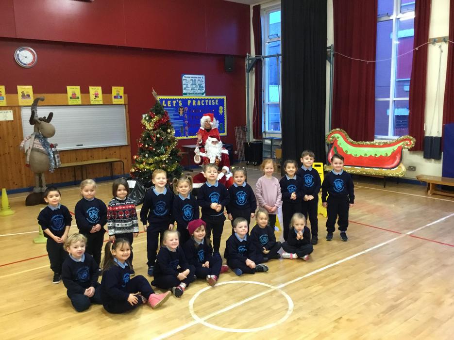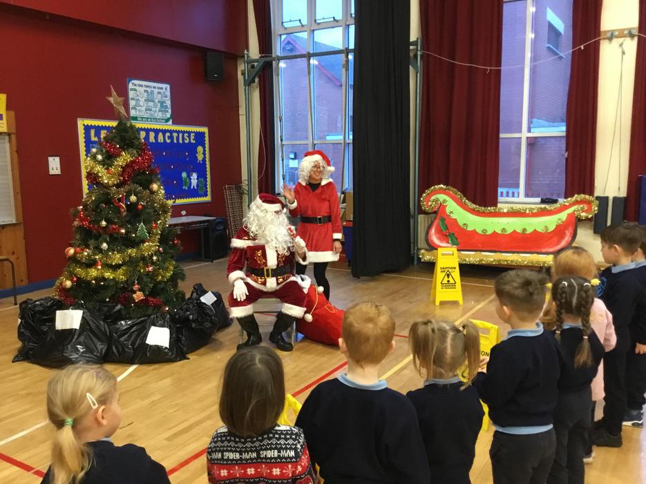 It was a very wet windy morning, so Santa called into the assembly hall with a little present for our pupils.