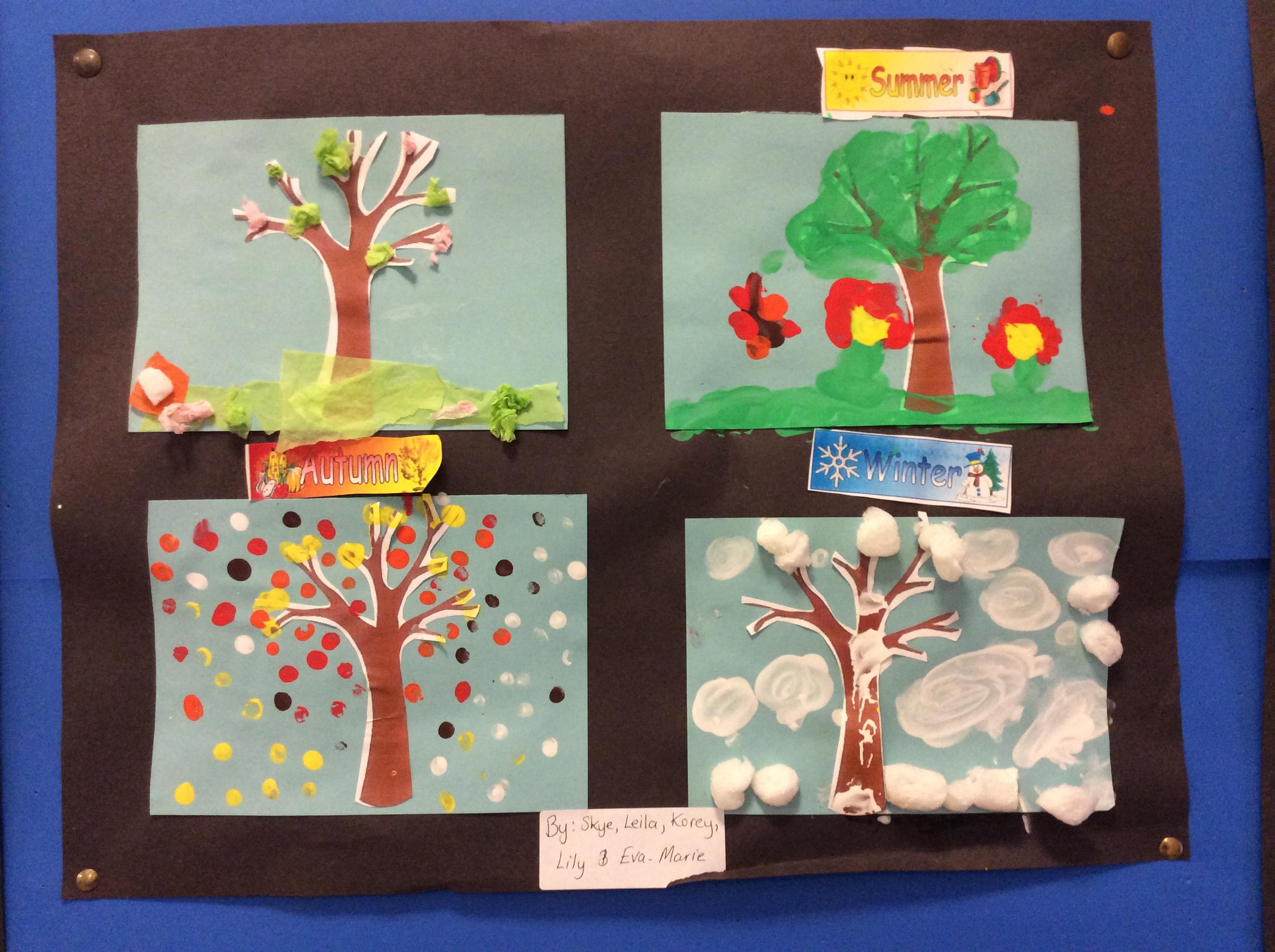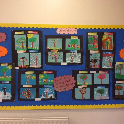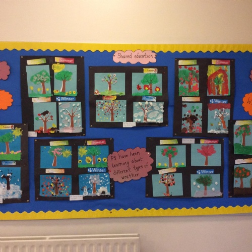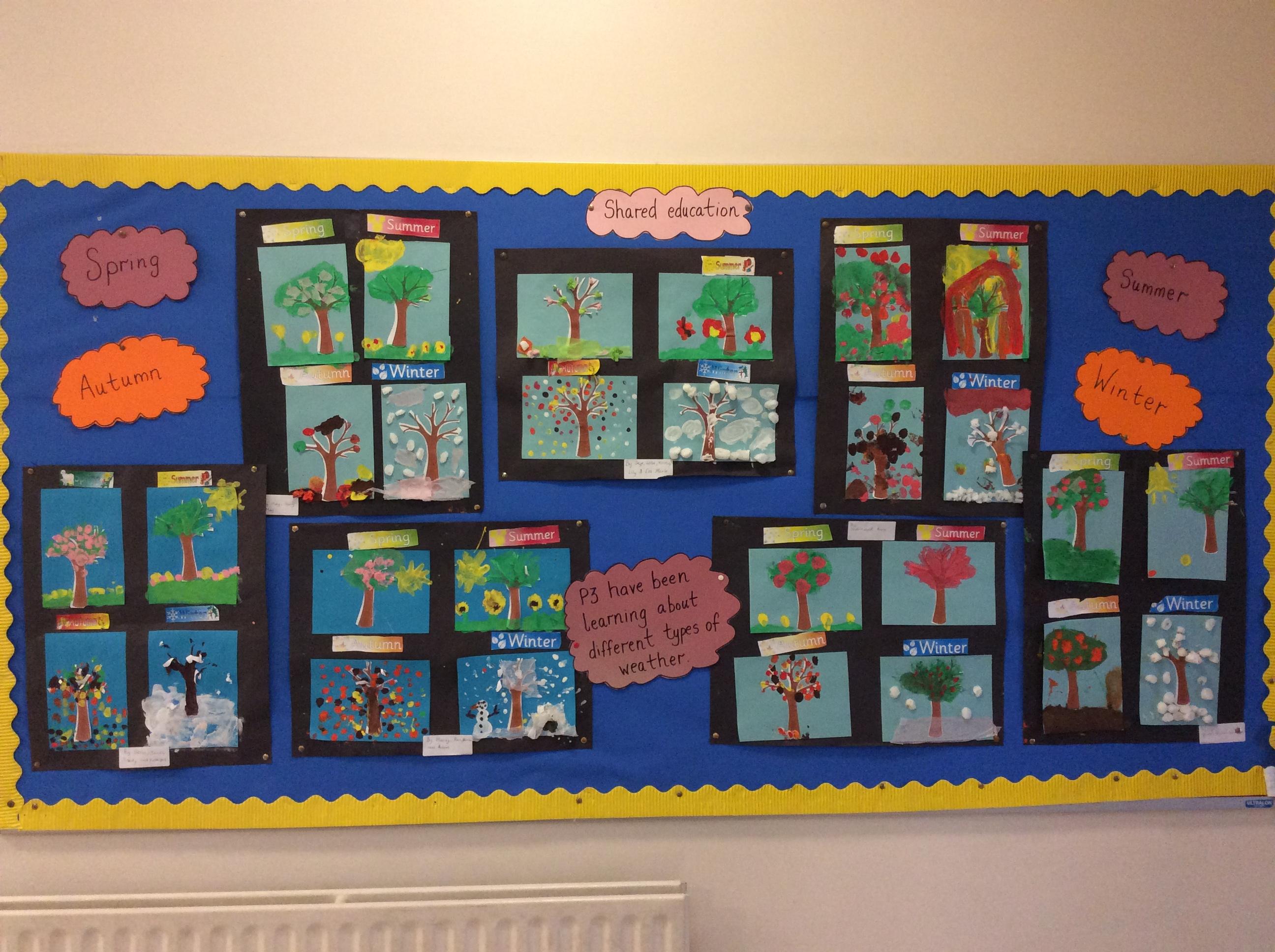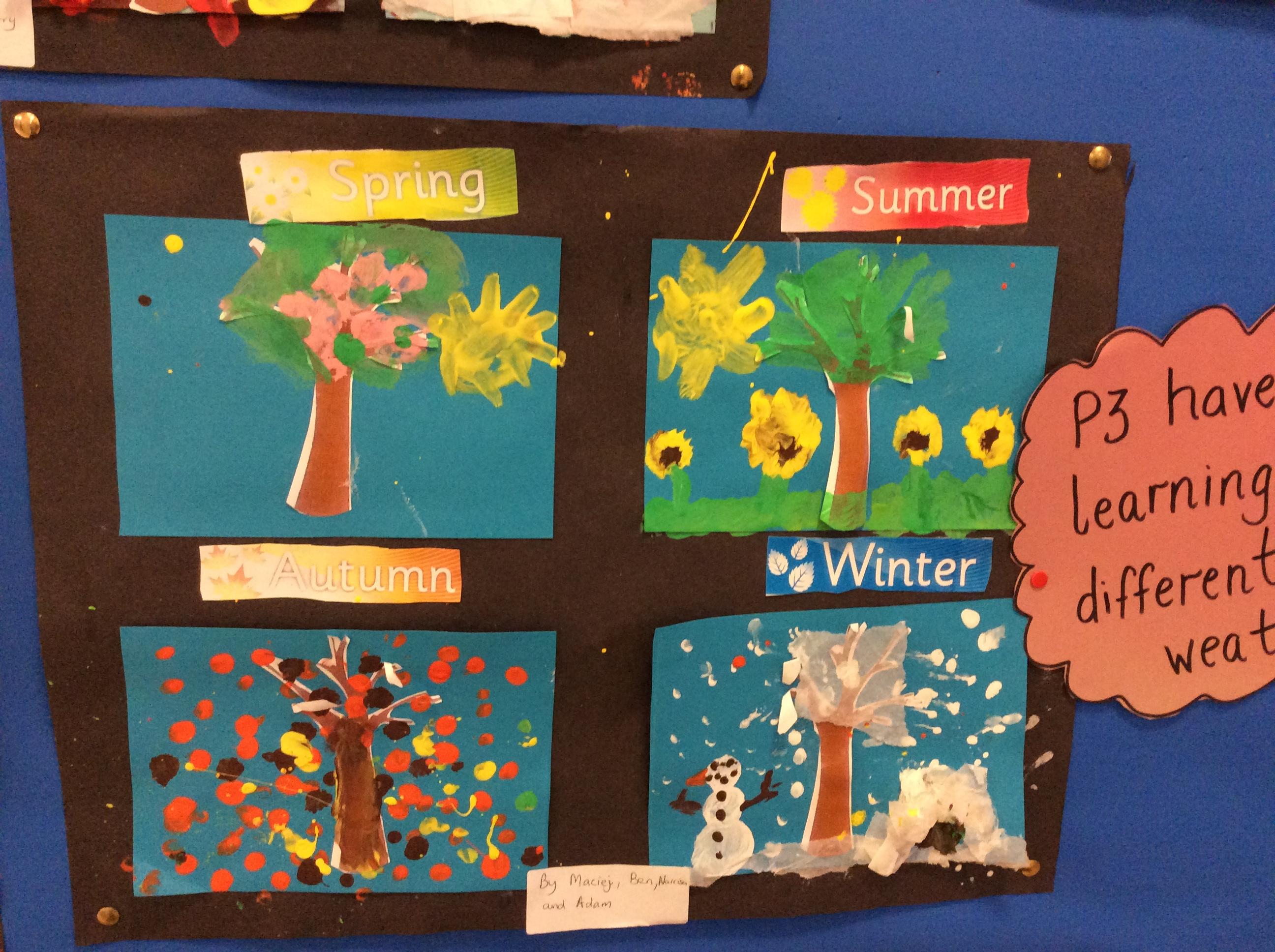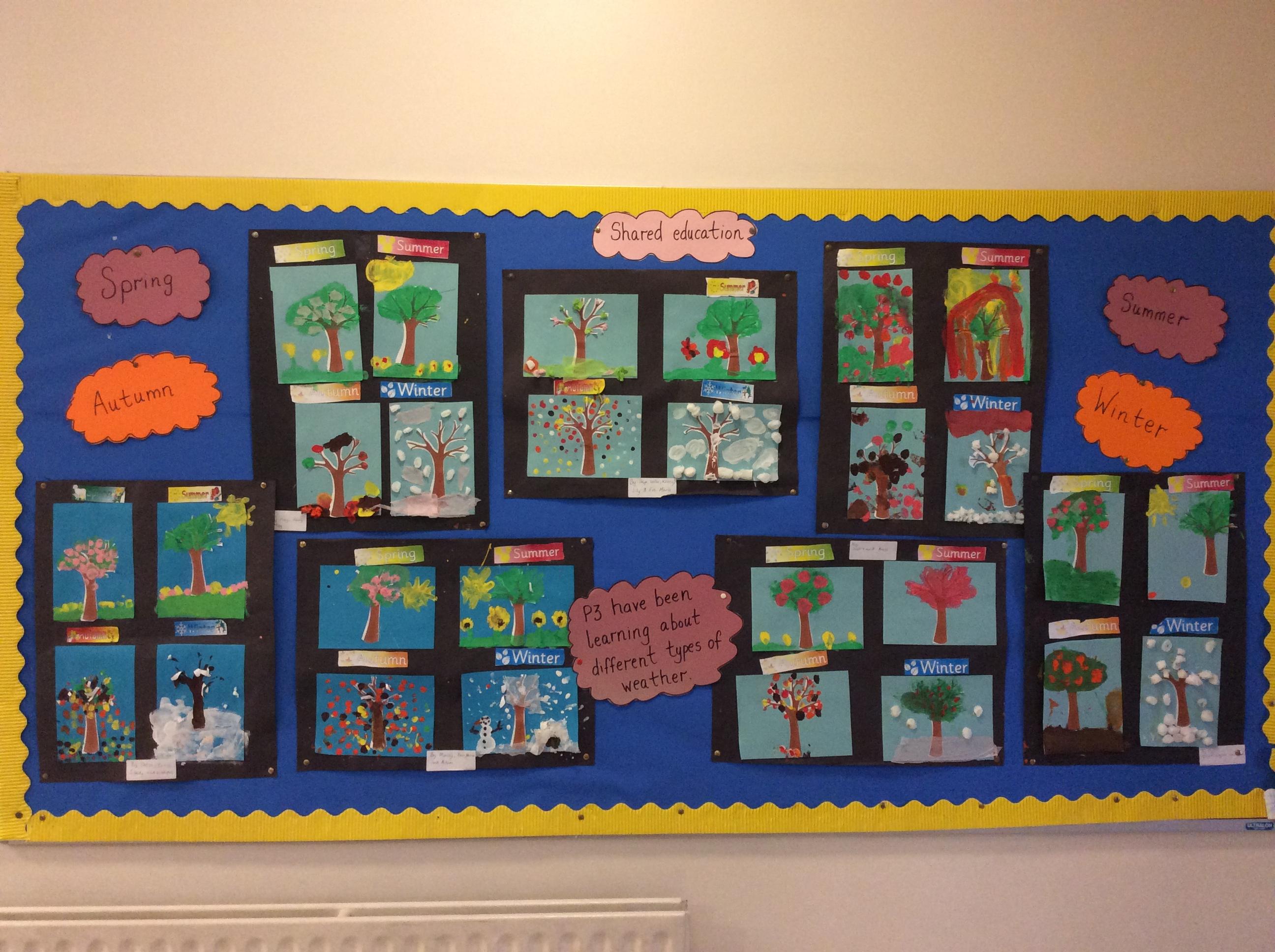 P3 have been working on the topic of weather with their friends at St Patrick's. Look at these lovely collages they have made together, looking at how the season affect our landscape and wildlife! Well done P3, you've done a great job!